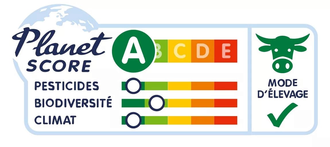 « Le Planet-score® est un système de notation complet et indépendant qui met à nu la valeur environnementale des produits. Vous pouvez le retrouver en photo. »