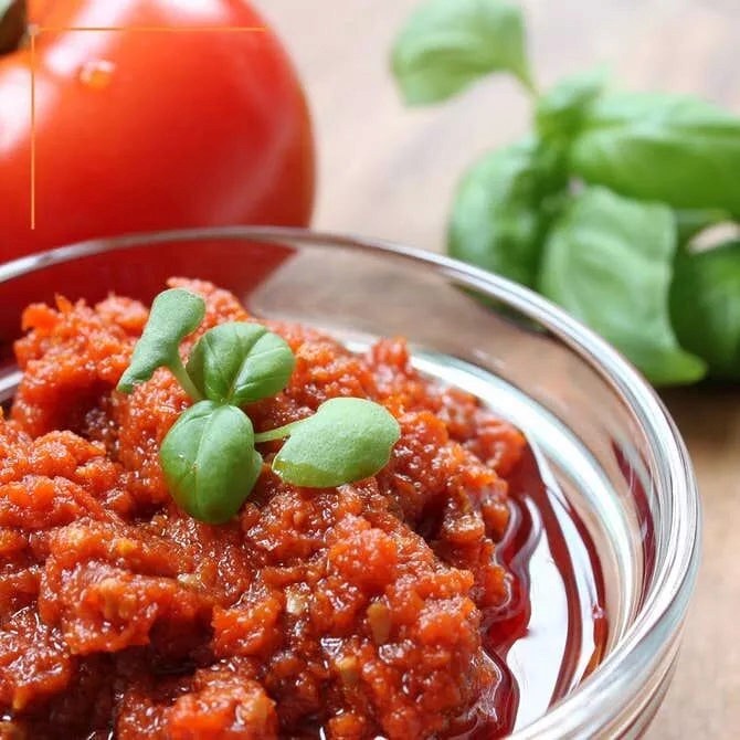 Transformation : Le basilic et les tomates sont sélectionnés et lavés manuellement, puis ils sont mélangés avec l'ail rouge de Nubie et les amandes ; le tout est enfin assaisonné avec de l'huile EVO, du sel et du poivre.