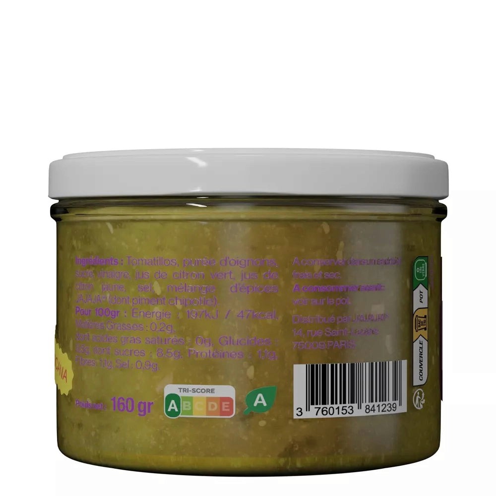 TOMATILLO, PURÉE D’OIGNON, SUCRE, VINAIGRE, JUS DE CITRON VERT, JUS DE CITRON JAUNE, SEL, MÉLANGE D’ÉPICES JAJAJA (DONT PIMENT CHIPOTLE).