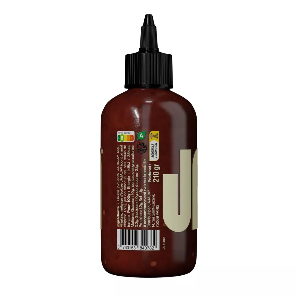EAU, COULIS DE TOMATE, VINAIGRE, MÉLANGE D’ÉPICES JAJAJA (DONT PIMENT CHIPOTLE 1,5%), JUS DE CITRON JAUNE, SEL.